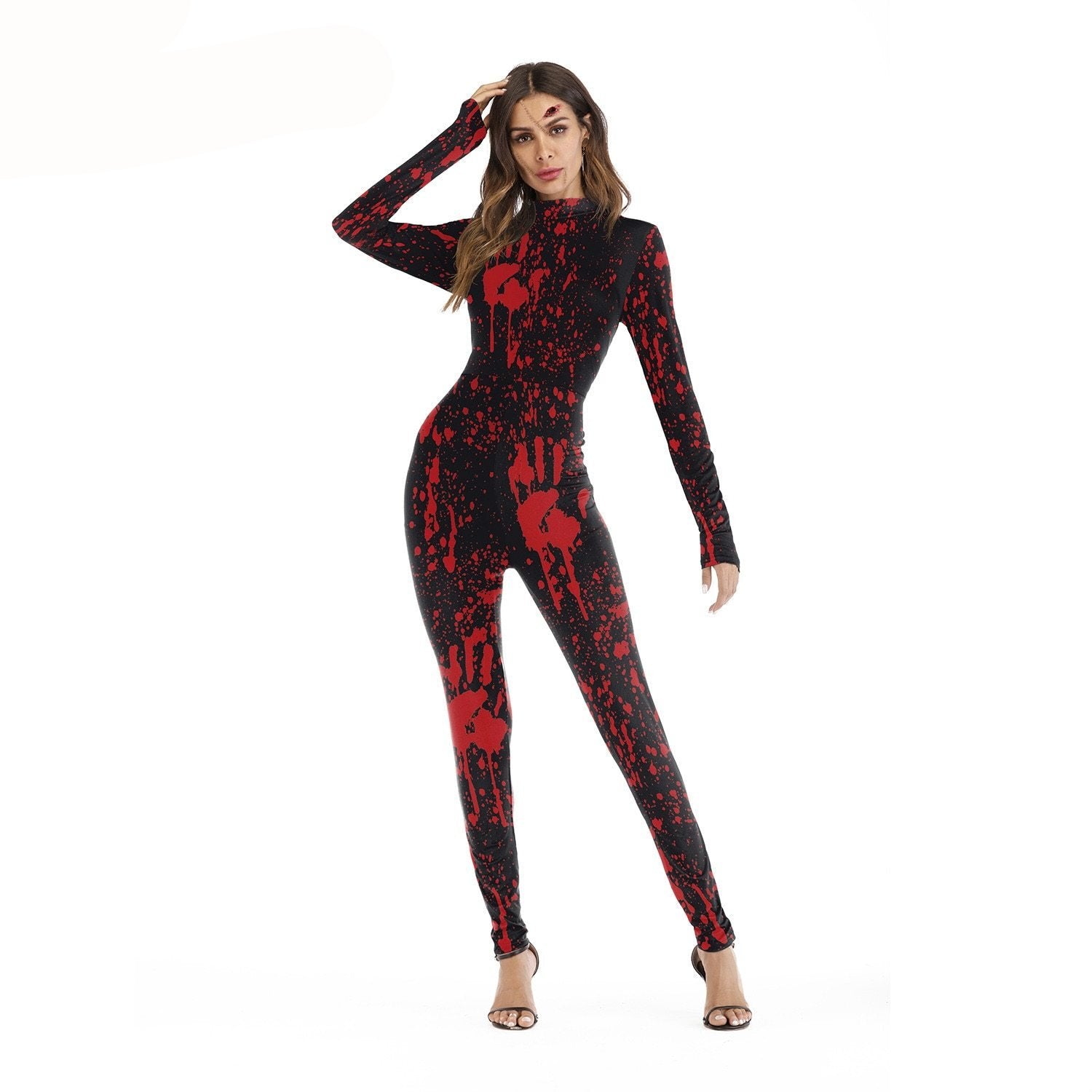 Sexy costume women halloween party jumpsuit catsuit scary bloody print back zipper