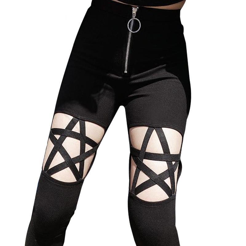 Sexy women tight pants black gothic leggings hollow out five-pointed star