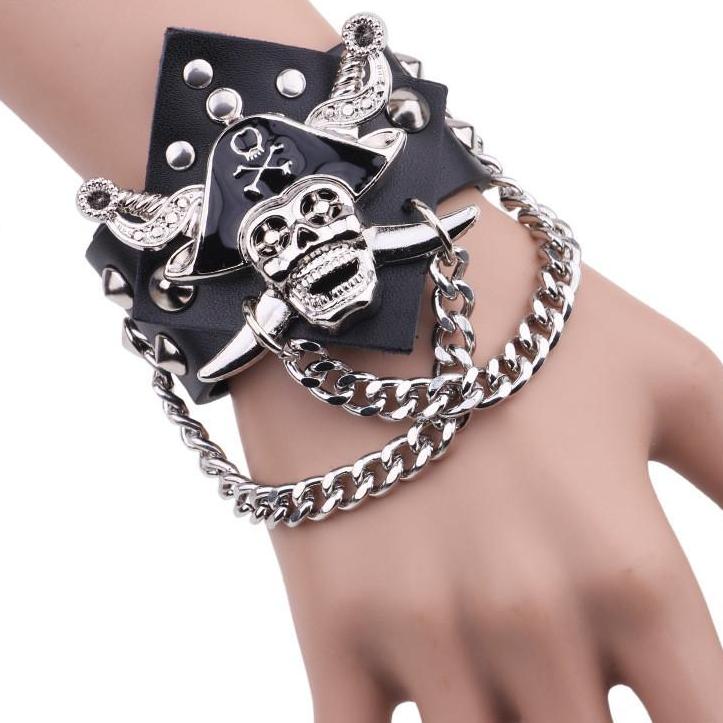 skull bracelet leather silver rivet pirates men women motorcycle biker