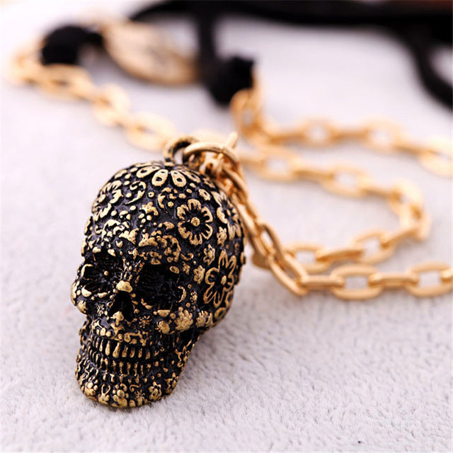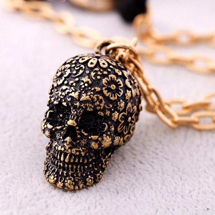 Vintage skull pendant necklace gothic flower CZ men women biker jewelry