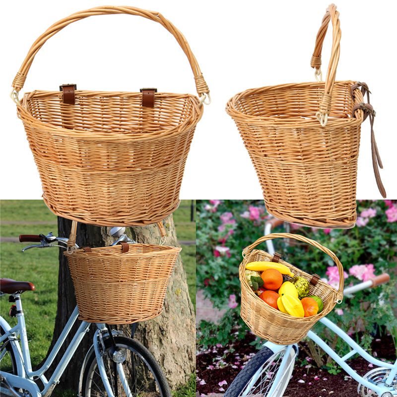Vintage wicker bicycle basket brown leather straps cycling basket mountain bike shopping